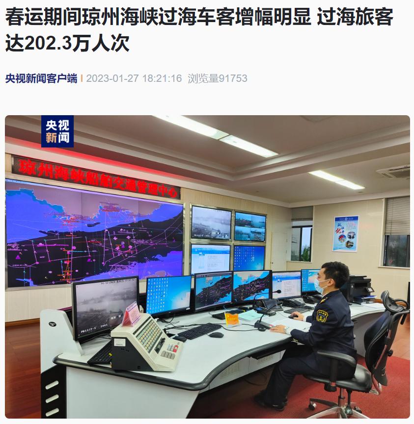 内容摘要:央视新闻记者从海口海事局获悉,今年春运期间琼州海峡过海车、客增幅明显,截至1月27日零时,琼州海峡过海旅客达202.3万人次、车辆52.2万辆次,同比分别增长54.3%和43.6%,较疫情前的2019年春运同期也分别增长20.2%和34.9%。(央视新闻客户端)新闻来源:海南海事局