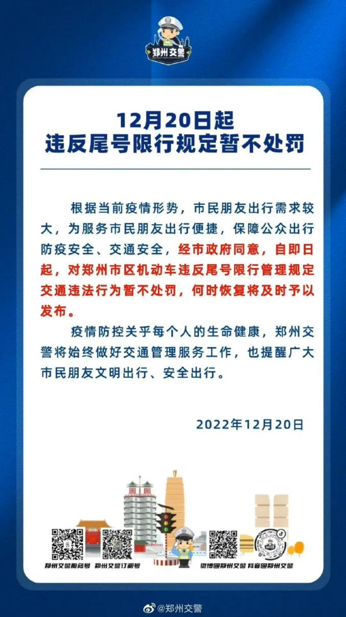2022年12月20日,郑州市公安局交通管理局发布消息称:从当天起郑州市区对机动车违反尾号限行管理规定交通违法行为暂不处罚。违反限行规定暂不处罚,官方给出了说明:疫情形势发生变化,市民出行需求较大,为服务市民出行便捷,保障公众出行防疫安全、交通安全而采取上述措施。对于何时恢复,当时并未明确时间,称“何时恢复将及时予以发布”。