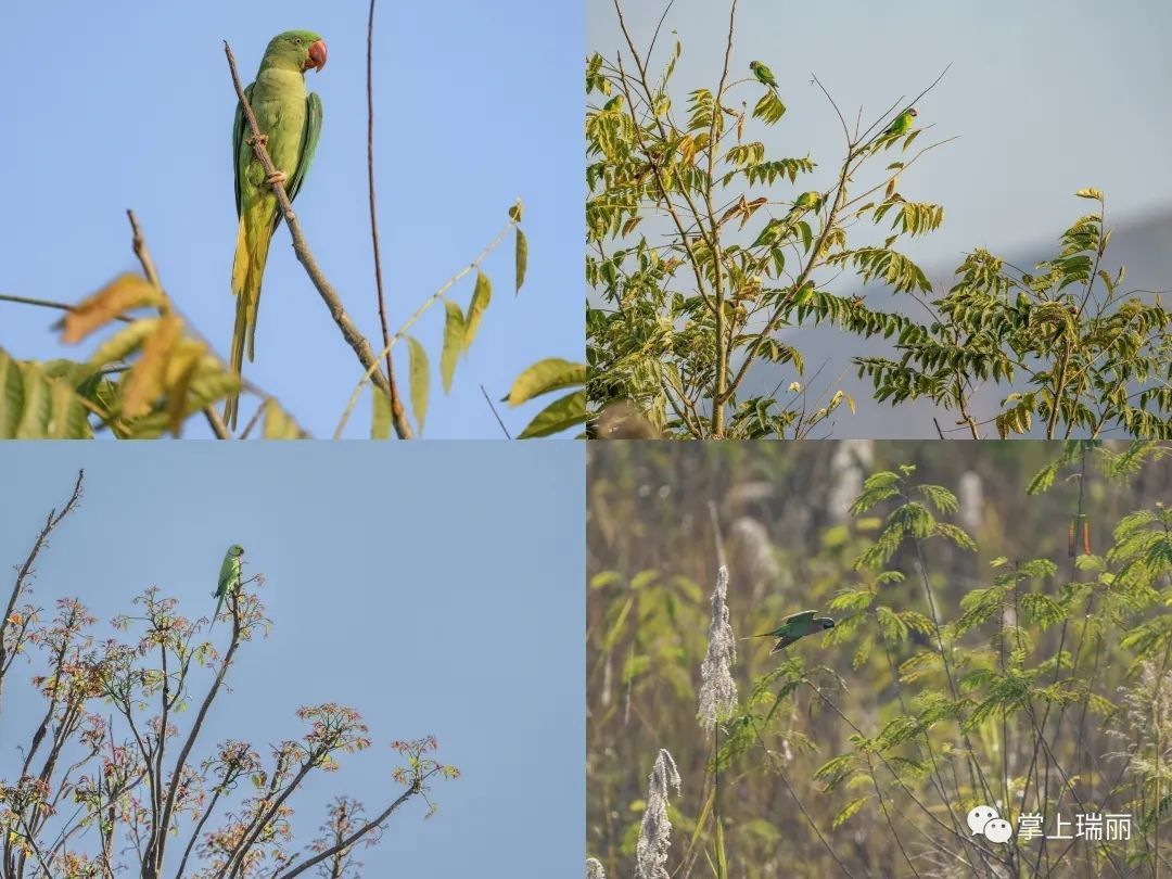 图左上为亚历山大鹦鹉,右上为灰头鹦鹉和花头鹦鹉,左下为红领绿鹦鹉,右下为绯胸鹦鹉(朱边勇 摄影)本次同时拍摄到5种鹦鹉的地点位于瑞丽江流域中缅边境中方一侧,该区域长期有花头鹦鹉等我国珍稀鹦鹉的记录。2022年9月11日,记者和自然生态摄影师曾在该区域拍摄到过22只花头鹦鹉同框画面,刷新当时该物种的国内记录。