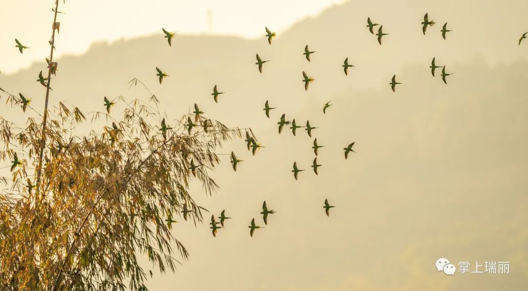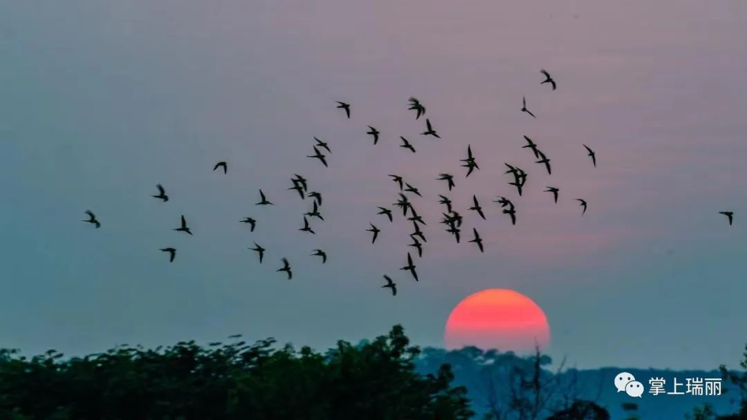 鹦鹉群与夕阳(孙冬军 摄影)原标题:《【生态瑞丽】上百只曾消失近百年的花头鹦鹉同框》