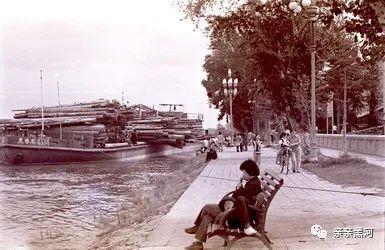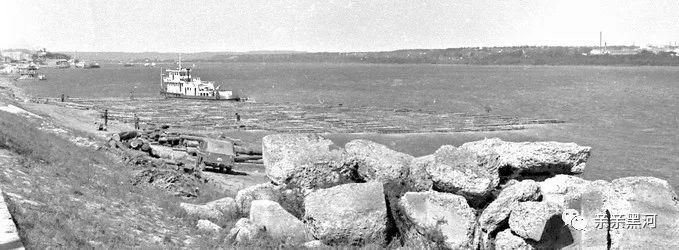 1980年代黑河黑龙江边的拖船木排和船载圆木