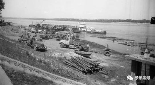 黑龙江边日军碉堡旁边的拖船与木排