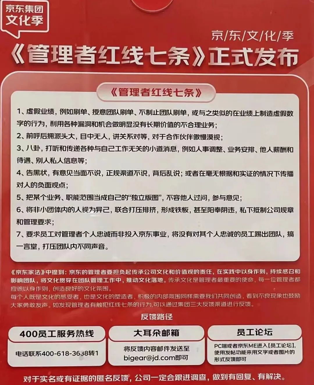 这些只是调整的一个缩影,却将严肃的整顿之风传递给了每一个人。据了解,京东还针对工作业绩诚信、个人作风、禁止小山头等内容确立了《七条红线》,大红的海报贴满了整个京东,甚至贴到了京东大楼的厕所里。