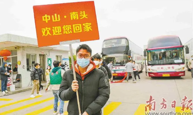 大年初四,由中山市人社局组织的首趟返岗专车抵达中山南头。 南方日报 图