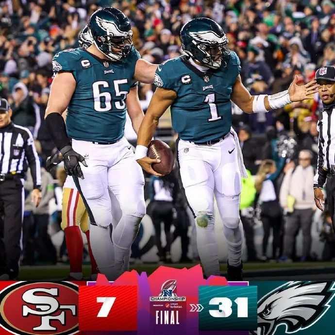 在率先进行的国联决赛中,49人主力四分卫普尔迪没能延续自己的菜鸟神迹,在比赛第六次进攻中受伤的他甚至都没有打完比赛,最终费城老鹰以31-7大胜旧金山49人脱颖而出,继2018年以后再次挺进超级碗!那一场比赛,他们以41-33击败了布雷迪的新英格兰爱国者,获得了队史首座超级碗的同时赢得了球队历史上的第四个NFL冠军,今年他们将向着队史第二座隆巴迪杯发起冲击!