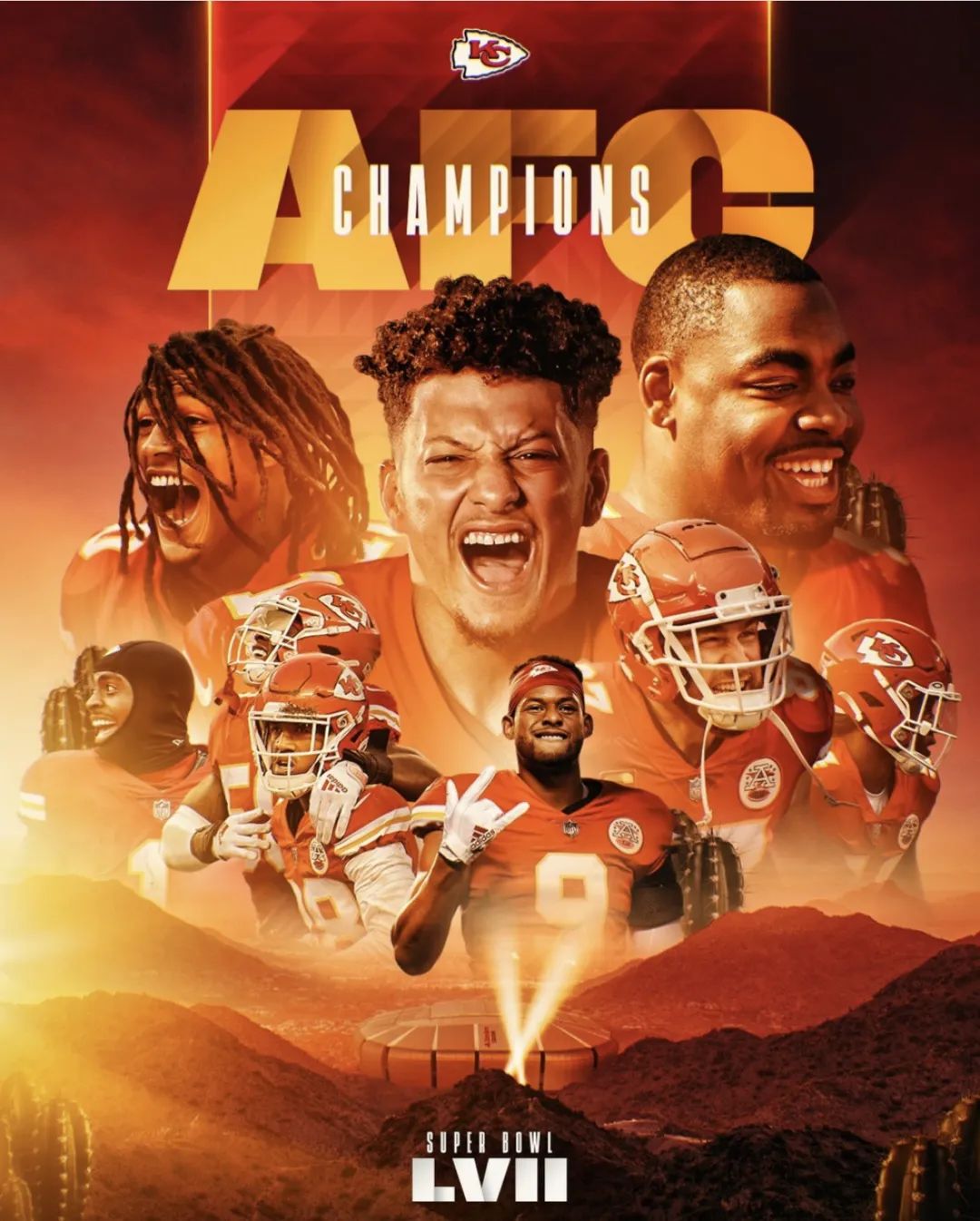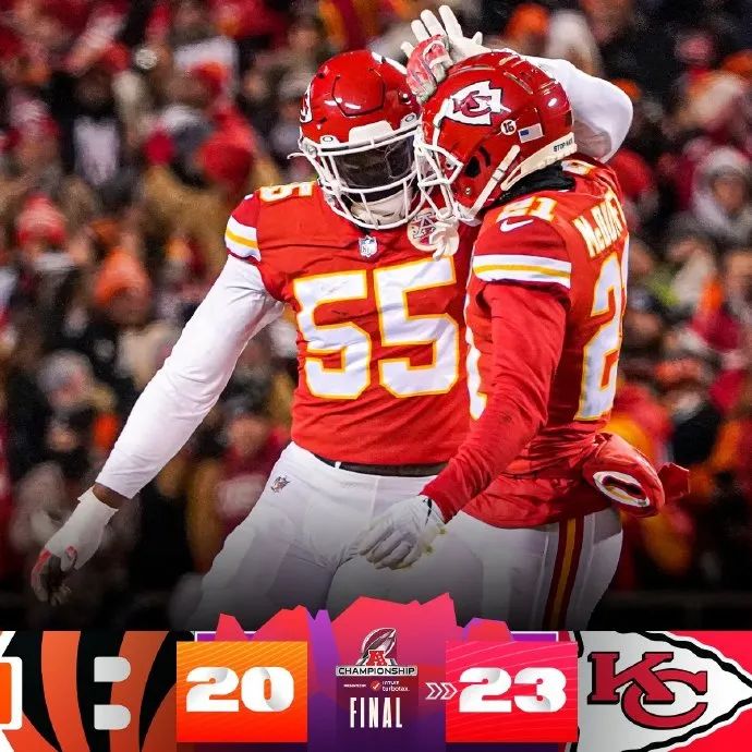 2022-23赛季 NFL国联冠军而在随后进行的美联决赛中,带着脚踝伤势的马霍姆斯没有在与乔·伯罗的对决中让三连败延续,在比赛最后时刻两队战成20平的情况下,主力四分卫马霍姆斯在带伤舍命挺进码数,最后由哈里森-巴特克在45码位置踢中任意球,帮助酋长得到3分锁定胜局,最终以23-20战胜对手挺进超级碗!这一场胜利不仅终结了酋长面对辛辛那提猛虎的三连败,还完成了去年在美联决赛不敌对手的复仇,而马霍姆斯更是带领球队四年三进超级碗!