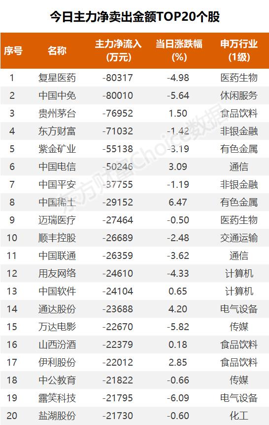 东方财富Choice数据显示,1月30日主力资金净卖出前20大个股中,主力净卖出最多的是复星医药,净卖出8.03亿元;排名第二的是中国中免,净卖出8亿元。