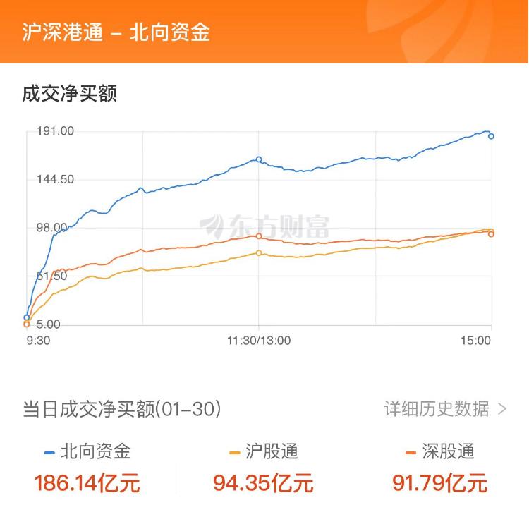 北向资金1月30日净流入186.14亿元1月30日,北向资金当日净流入186.14亿元。其中,沪股通当日成交净买额为94.35亿元;深股通当日成交净买额为91.79元。