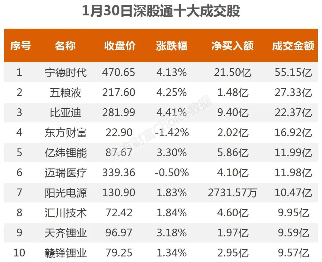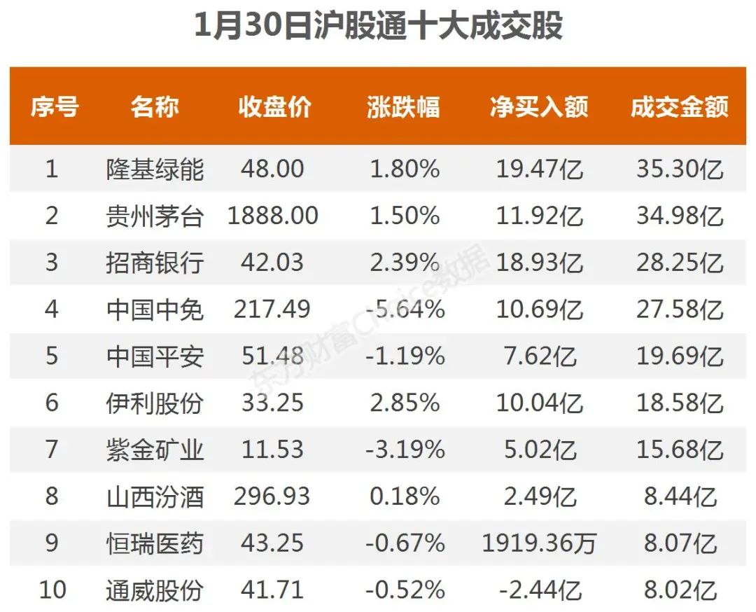 交易所公布的沪深港通十大成交股显示,1月30日北向资金大幅净买入宁德时代21.50亿元,净买入隆基绿能19.47亿元,净买入招商银行18.93亿元,同时大幅净卖出通威股份2.44亿元。