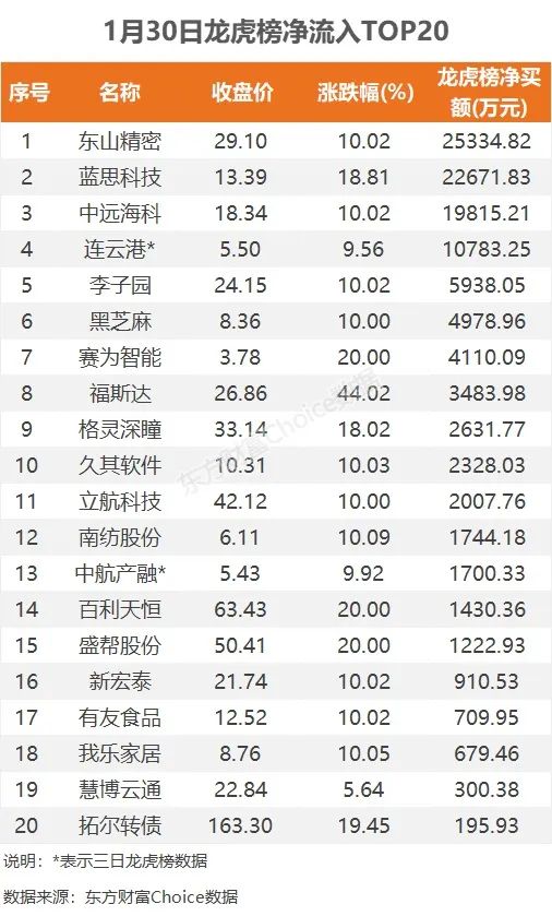 龙虎榜:2.5亿抢筹东山精密 机构净买9股上榜龙虎榜个股中,资金 净流入最多的是东山精密,为2.5亿元。数据显示,该股日内涨停收盘,全天换手率4.52%,2023年以来累涨17.67%。资金净流入居前的深股通席位净买入1.72亿元,申万宏源上海昌化路净买入1.7亿元。