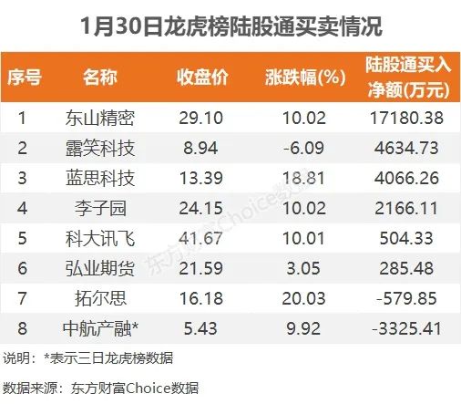 陆股通参与龙虎榜中个股共涉及8股,其中6股被陆股通净买入,除前文提及的东山精密外,露笑科技、蓝思科技和李子园也被陆股通净买入过千万。另外2股被陆股通净卖出,中航产融被卖出较多,三日净卖出3325.41万元。