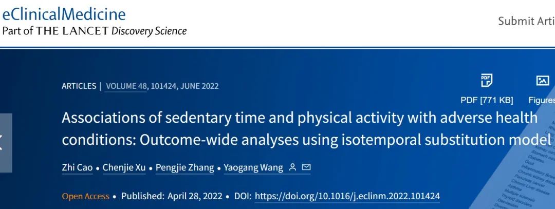 权威期刊《柳叶刀》子刊发表研究,近日,天津医科大学在著名医学期刊柳叶刀子刊《EClinicalMedicine》上发表了一篇文章“Associations of sedentary time and physical activity with adverse health conditions: Outcome-wide analyses using isotemporal substitution model”,将久坐的伤害量化,并对比了不同状态下的久坐伤害值。