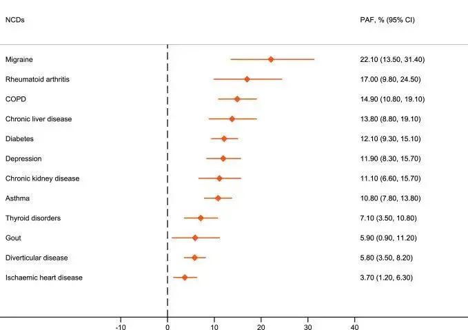 久坐>6小时与12种疾病风险关系研究发现,与每天久坐≤2小时的人相比,每天久坐>6小时的人患12种慢性病的风险增加26.7%,包括缺血性心脏病、糖尿病、慢性阻塞性肺疾病、哮喘、慢性肾脏病、慢性肝病、甲状腺疾病、抑郁、偏头痛、痛风、类风湿性关节炎、憩室疾病(指胃肠道内的一种以囊状突起为主要病灶的消化道疾病)。