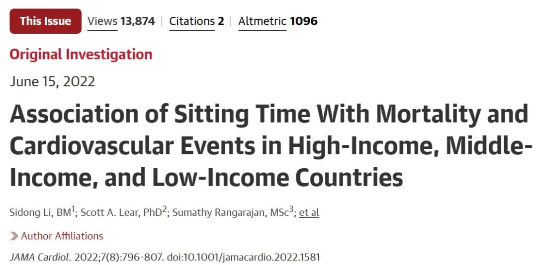 2022年6月,中国医学科学院北京协和医学院国家心血管病中心李伟教授与加拿大西蒙菲莎大学 Scott Lear 教授领导的研究团队在《JAMA Cardiology》上发表了题为“Association of Sitting Time With Mortality and Cardiovascular Events in High-Income, Middle-Income, and Low-Income Countries”的文章,通过对来自5大洲21个国家超过10万人的调查,进一步证实久坐不动会增加心血管疾病和全因死亡风险;而且,这种风险在中低收入国家更为突出。