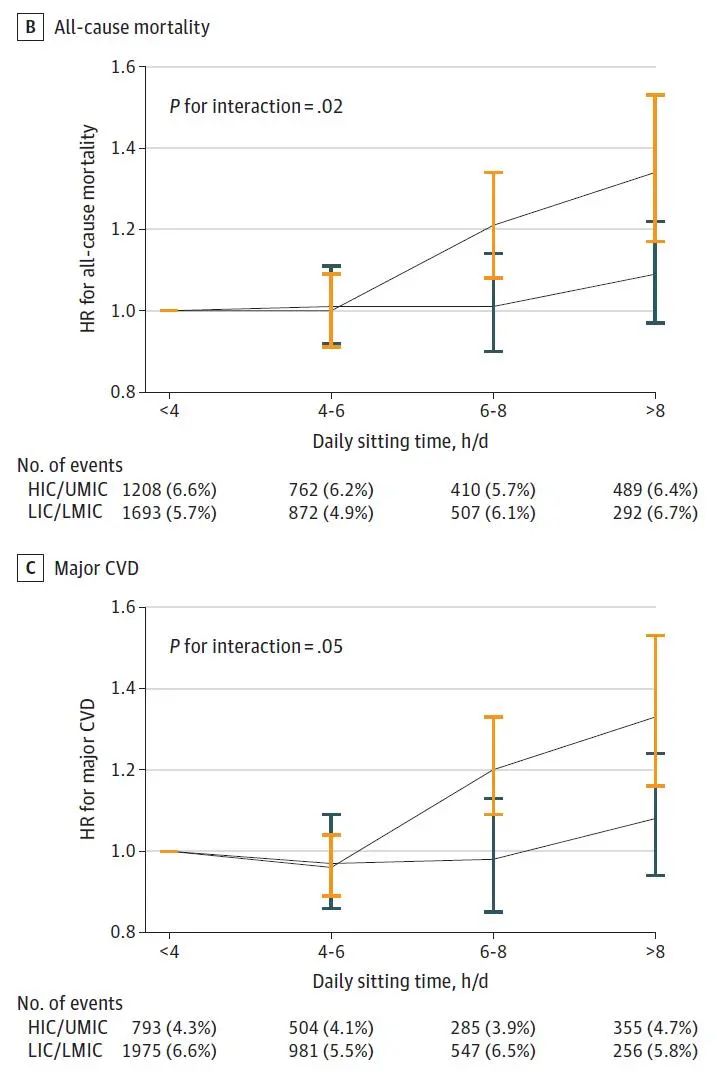 https://jamanetwork.com/journals/jamacardiology/article-abstract/2793521研究人员根据每天久坐时间将这些人分为四组:每天<4 小时组(对照组)、每天4-6小时组、 每天6-8小时组,以及每天≥8小时组。在平均11.1年的随访期间,记录了6233例死亡和5696例主要心血管事件(包括心肌梗死、中风、心力衰竭和心血管死亡)。