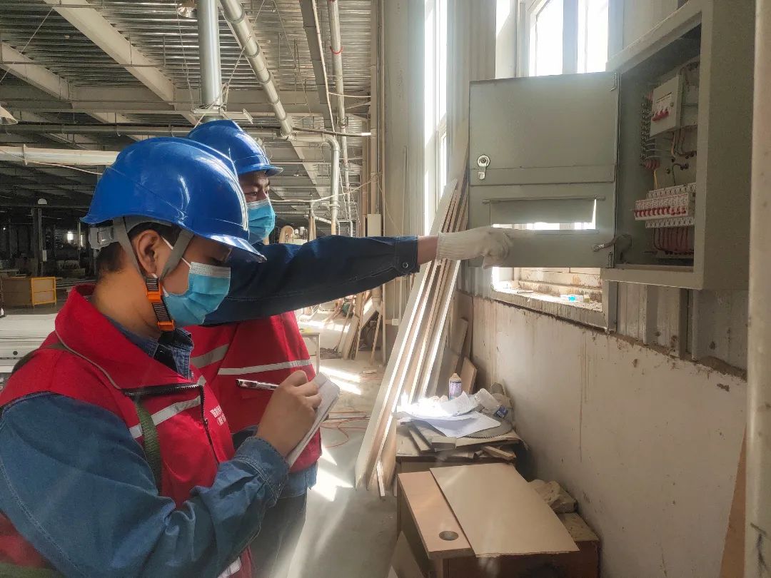 1月29日,河北衡水深州供电公司党员服务队队员在深州市全德隆创意家具有限公司检查车间配电设备运行情况。(张照希)