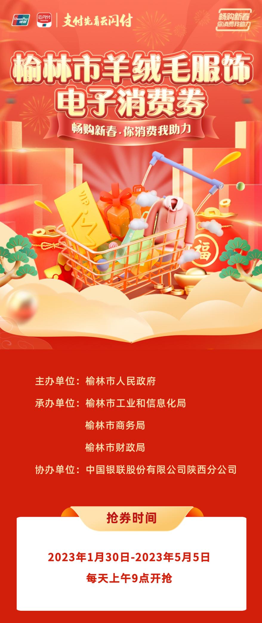 继1月9日起发放1亿元电子消费券之后,榆林今年又一波消费券发放活动启动。从1月30日开始,全市再投放2000万元羊绒毛服饰电子消费券,支持和助力本地服装企业产品销售,拉动区域内经济循环。