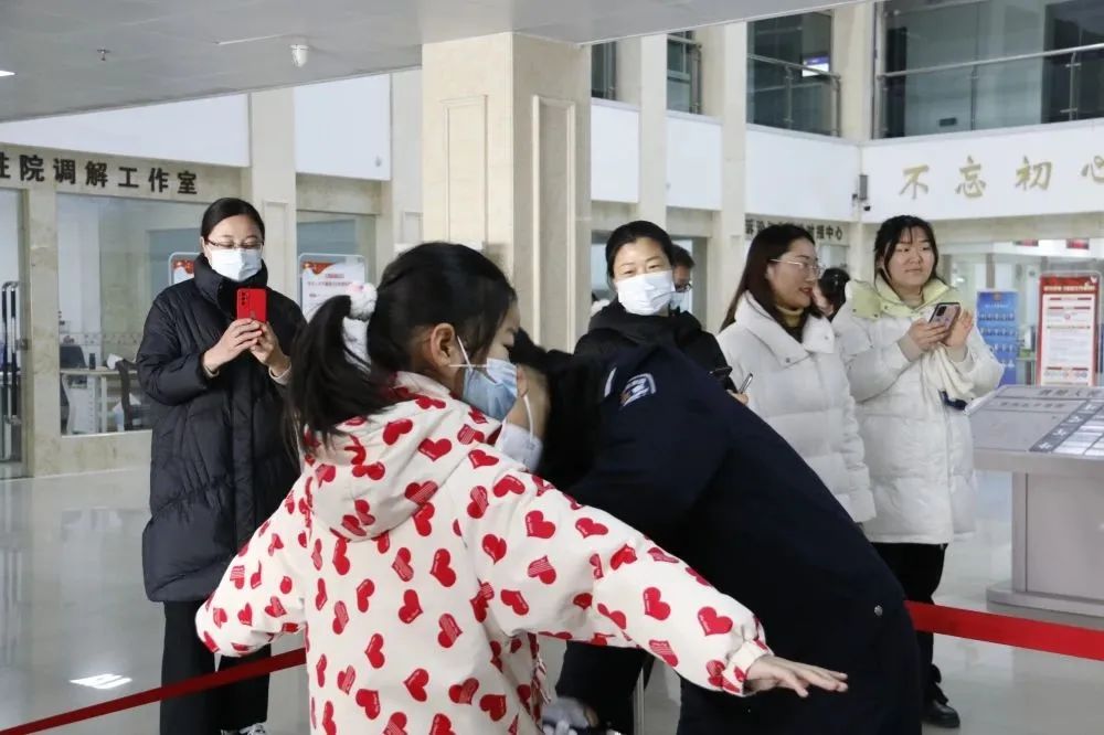 在少年及家事庭讲解员的引领下,30余名儿童走进法院,先后参观了法院诉讼服务大厅、羁押室、科技法庭、院史馆等,零距离感受法院的工作、接受法治的熏陶。