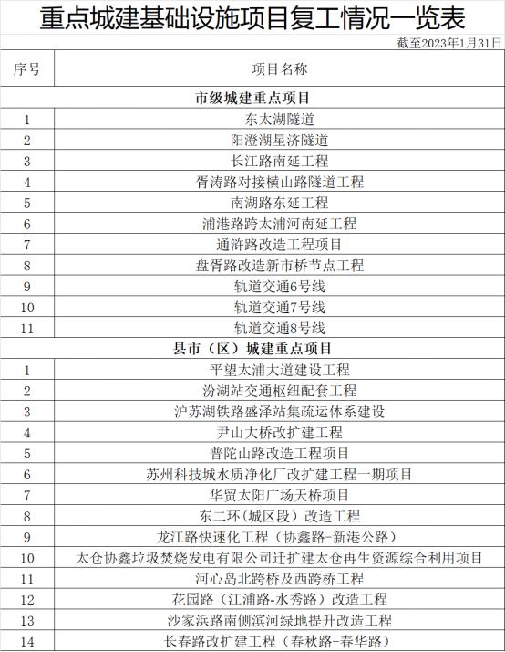 苏州市住建局消息,截至1月31日,苏州市及县市(区)已有25个城建基础设施重点项目复工,施工单位管理人员已到岗2335人,施工人员已到岗5457人。