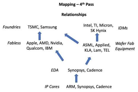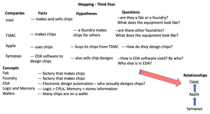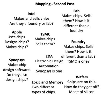我告诉 Shenwei ,我为他感到高兴,因为他刚刚得到了一个很棒的学习机会——如何快速理解,然后映射一个新市场的版图。他给了我一个“你说得倒容易”的眼神,但在他反驳我之前,我递给他一支笔和一张餐巾纸,让他在30秒内写下他所读到的与半导体业务有关的公司和概念的名称。他很快想出了一个包含9个名字 / 术语的清单。