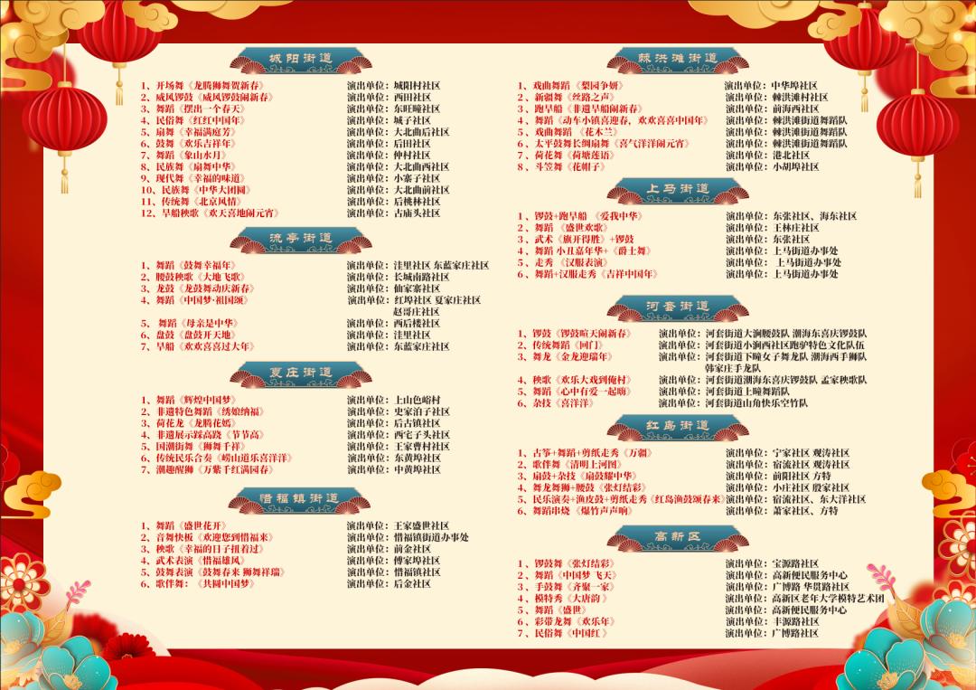 花灯会、猜灯谜、游园会、秧歌巡游、舞龙祈福、烟花秀、兔子灯DIY、豆面灯展、音乐会......