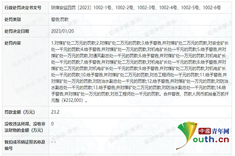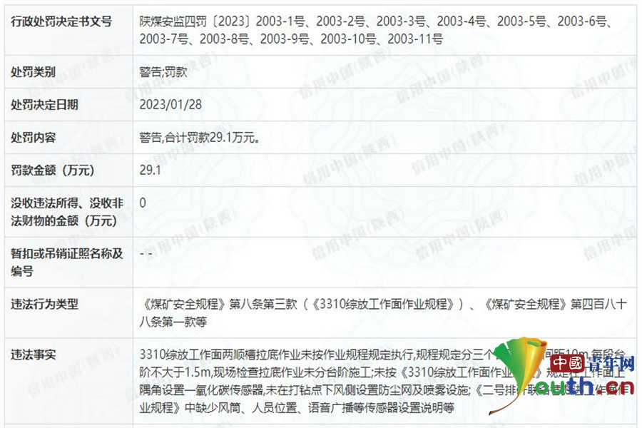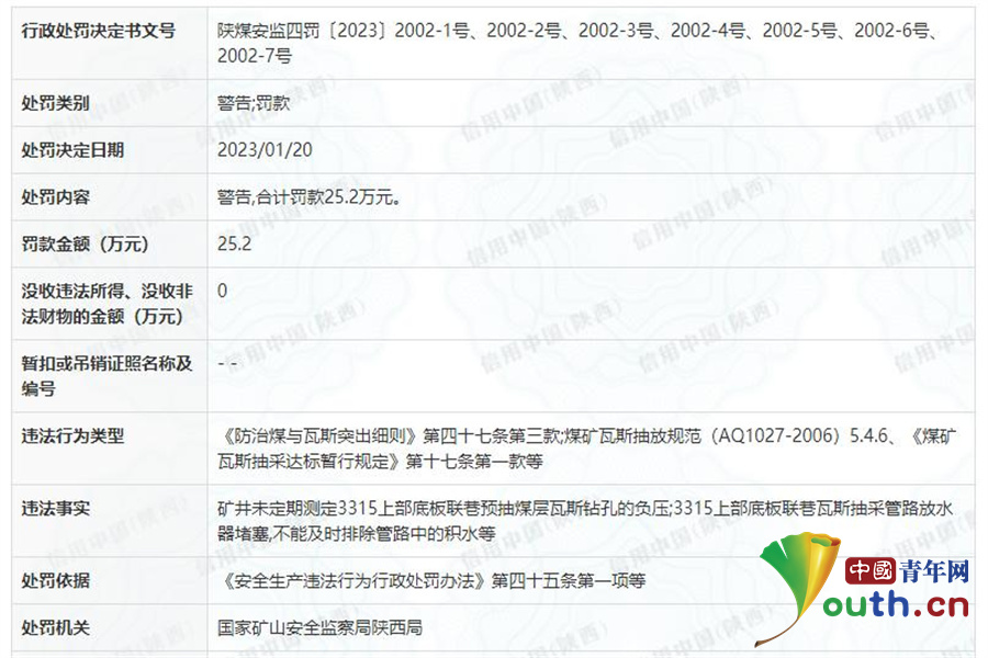 其中,陕西陕煤澄合矿业有限公司西卓煤矿因违反《中华人民共和国安全生产法》第三十六条第一款(《煤矿安全规程》第一百五十五条第一款)、《中华人民共和国矿山安全法实施条例》第十七条第一款等多项条款,于2023年1月20日被国家矿山安全监察局陕西局给予警告并处罚款23.2万元。