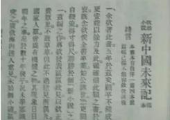 一九〇二年梁启超创作了《新中国未来记》作为科幻小说,梁启超的叙事设计其实非常浅薄,他只是运用“未来完成式”时空,说明他个人的憧憬。小说灵感源自美国作家爱德华·贝拉米(EdwardBellamy)写于十九世纪末的《回头看》(亦译《回顾》,Looking Backward),这部小说经过传教士李提摩太的传译,在十九世纪九十年代成为中国少数知识分子手中流传的读物。另外的灵感源头包括日本的政治小说如《雪中梅》等。在梁启超笔下,这些小说脱胎换骨成《新中国未来记》。
