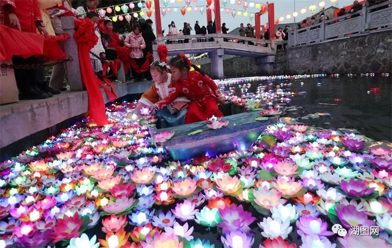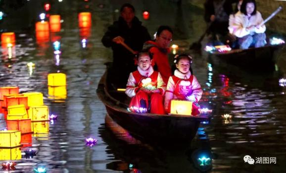 德清县乾元古城县桥河,市民坐船放河灯,体验古老元宵习俗。湖图 谢尚国