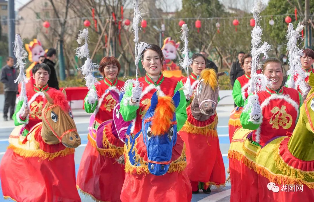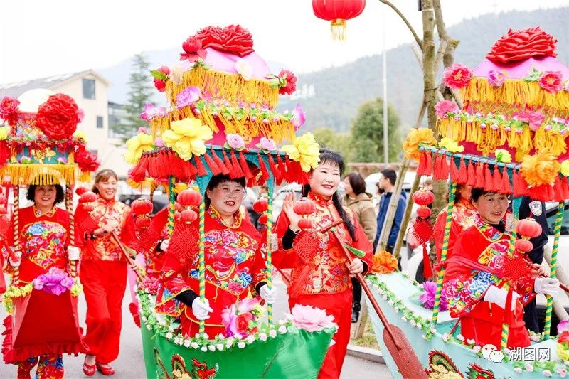 2月2日,德清县舞阳街道上柏村举行民俗巡游闹元宵活动,民间艺人们身着各色服饰,表演舞龙、跑马灯、水上戏曲等传统非遗民俗节目。湖图 谢尚国