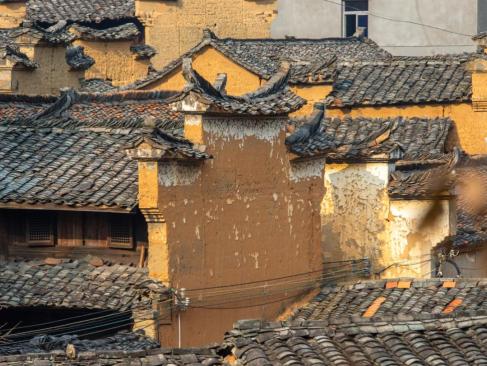 村口的两棵参天古树并为连理枝,往里走,土黄色的泥墙在太阳的照射下,反射出金灿灿的光。一层层马头墙翘首相对,错落有致,让人挪不开眼,沉醉在古典气息之中。