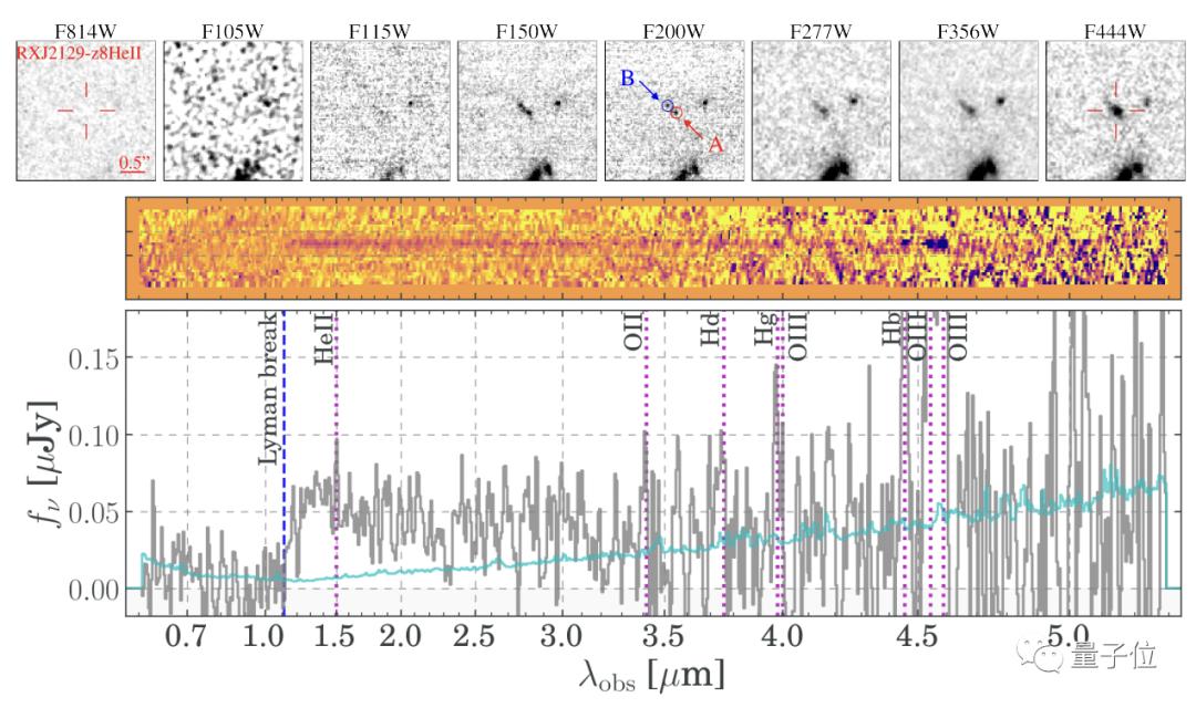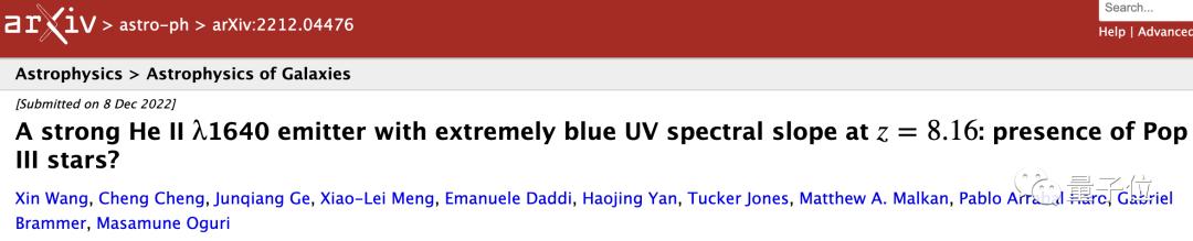 具体来说,研究者们对韦布望远镜传回的2000多个光谱数据进行分析,在一个遥远星系中发现了关键的氦II特征。这也恰恰证实了由氢、氦作为主要元素组成的第一批恒星的存在。