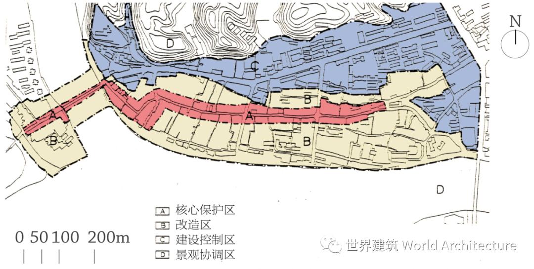 5屯溪老街保护规划保护区划,1986, 引自参考文献[4]以上方法与倡导也在后续各地的历史文化街区保护实践中得到推广,在历史地段的格局管控上起到了重要作用。之后的《历史文化名城保护条例》(2008)《历史文化名城保护规划规范》《编制要求》确立了历史文化街区保护要求与方法,均沿用或细化完善了这样的保护控制方法。例如在《历史文化名城保护条例》中,明确规定历史文化街区应划分核心保护范围与建设控制地带,并给予不同管控强度的要求;在《历史文化名城保护规划规范》等规范性技术指导文件中,对区划的构成与管控具体要求予以了进一步细化。在历史文化街区的空间格局维持与管控方面,以分区管控为核心的格局管控方法得到了确立,是目前历史文化街区保护实践实施中的空间管控模式(图6)。
