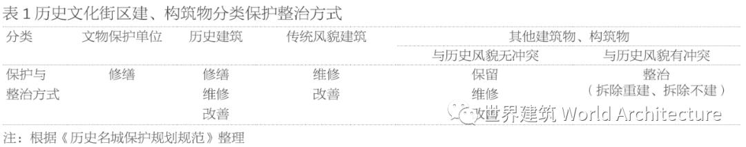 7北京国子监历史文化保护区建筑分类保护更新措施,来源:清华大学建筑学院.北京国子监—雍和宫历史文化保护区保护规划,2001以上方法也随着《历史文化名城保护条例》(2008)与之后的《历史文化名城保护规划规范》等法规、技术规范的不断完善与颁布,正式确立为历史文化街区内以分类保护整治为措施的科学处理方法,对历史文化街区内建筑予以分类施策(表1)。目前,国内所有的历史文化街区保护规划实施基本均以以上两方面模式作为基础范式,针对全面要素的保护深入探索有效的科学保护方法。