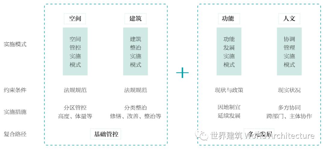 综合来说,在历史街区的保护实施工作中,应在空间与建筑方面,加强基础管控,严守底线,保护好街区丰富遗产;而在功能与管理方面,可以通过注重提升,综合协同,多元谋划持续发展。以4个方面综合构成的复合实施模式共同推进历史文化街区的保护提升实施工作。