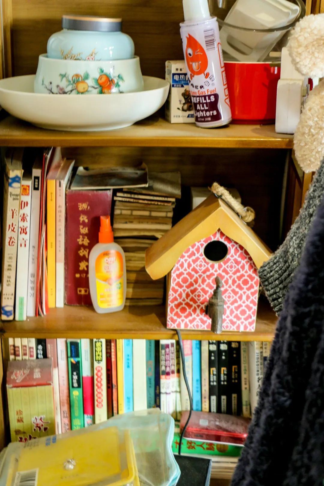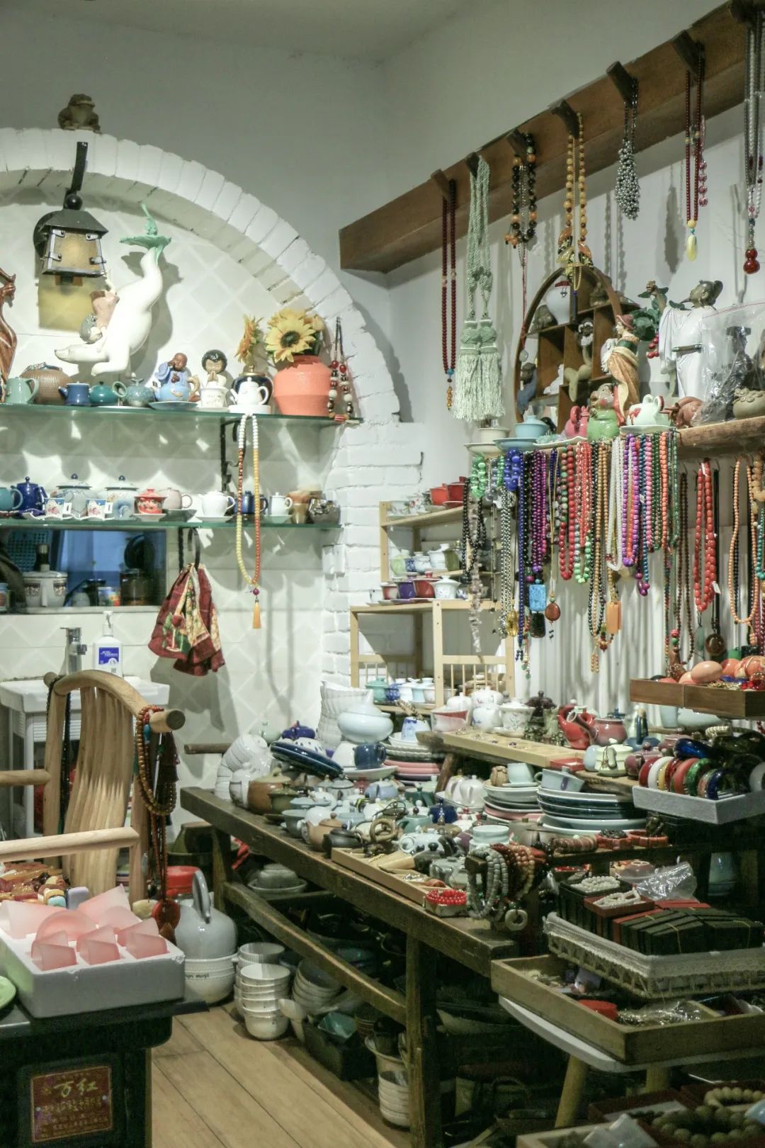 门脸是日式的木结构,醒目、温馨,充满故事感。踩着门口的脚蹬踏入店内,瓶瓶罐罐,杯杯盏盏,珠珠串串直接奔袭到你眼前。仔细一看,还有许多旧书、包包、摆件、衣服、小玩意儿堆在角落,要挨着看一遍大概需要花上一阵功夫。