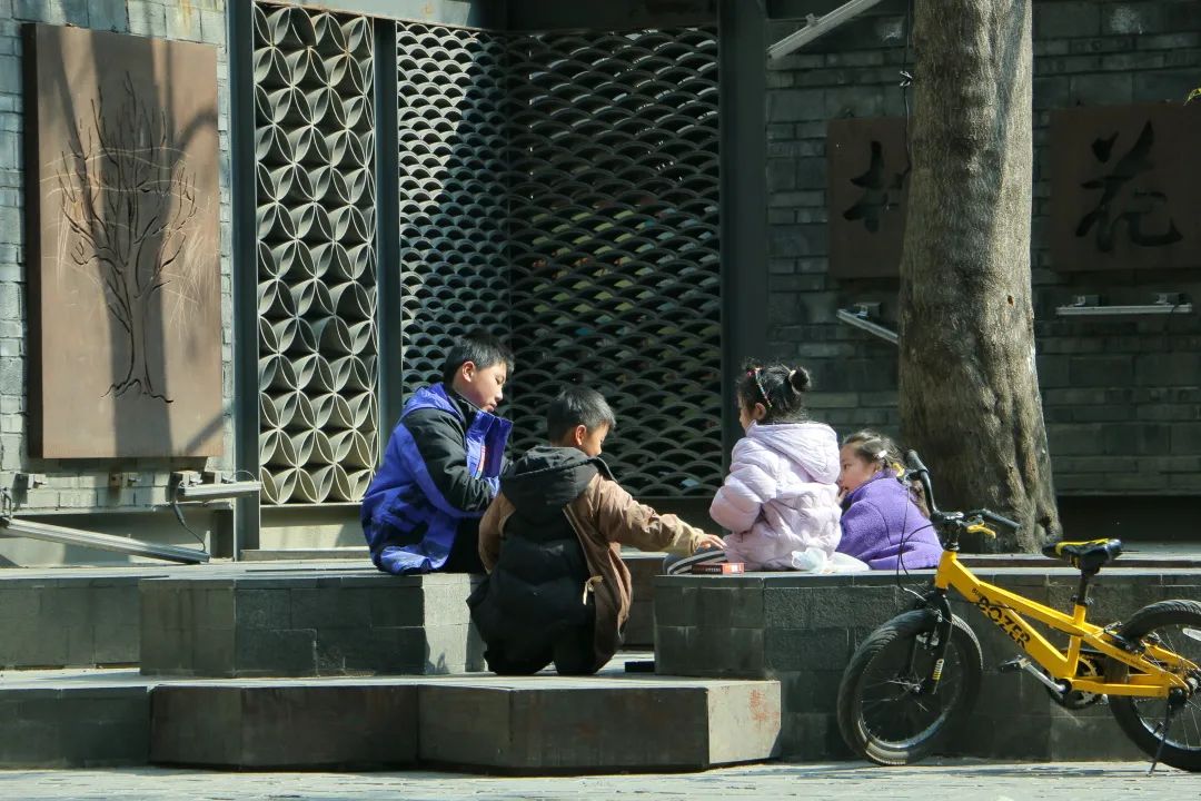 走至街道深处,一棵高大的泡桐树,光秃秃地在过冬。前一秒风刮过还很冷,站了没几分钟,太阳出来,几个小孩溜到树下开始晒着太阳玩游戏,欢声笑语间,泡桐树的影子,正好打在墙面上绘制的泡桐树图案上。