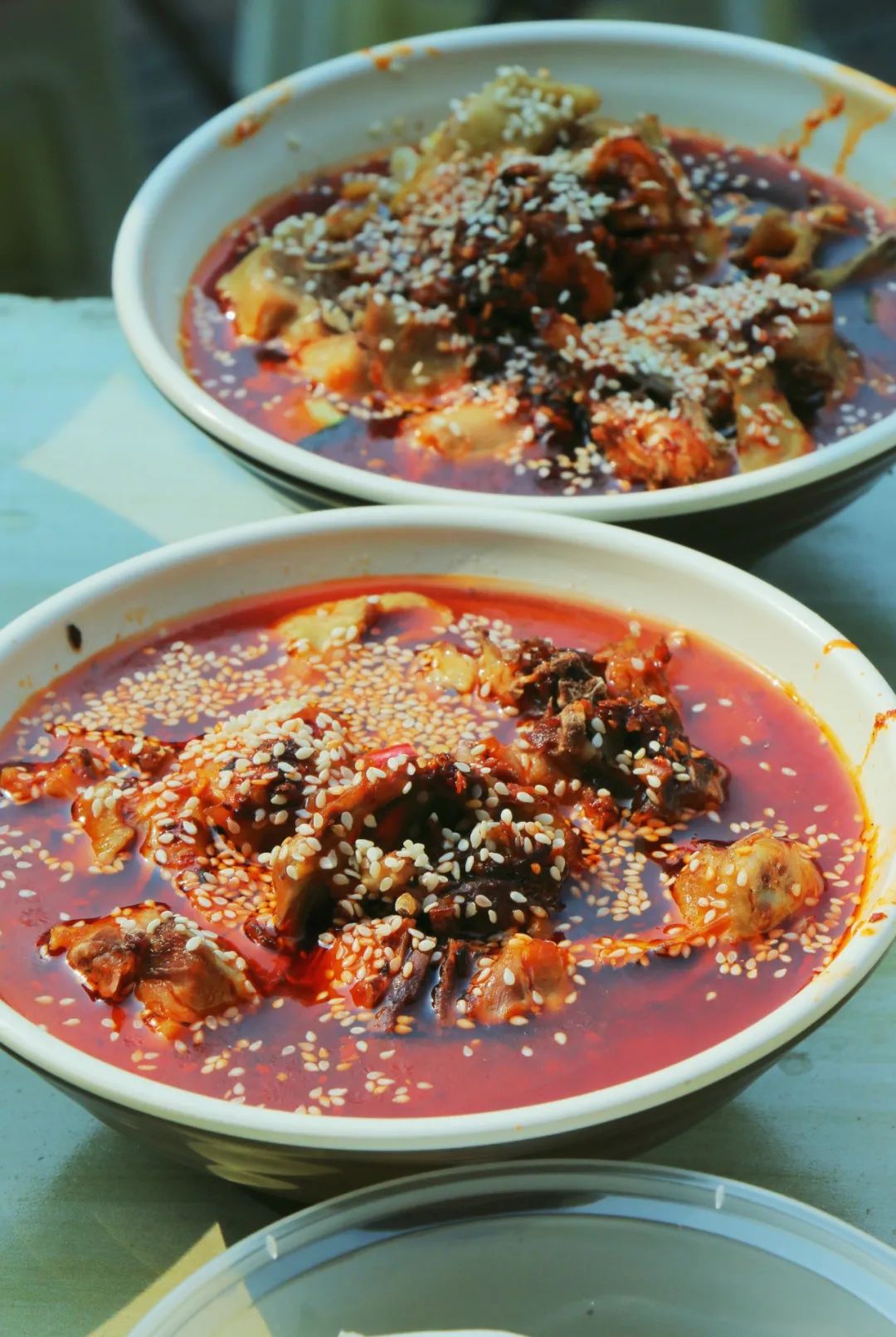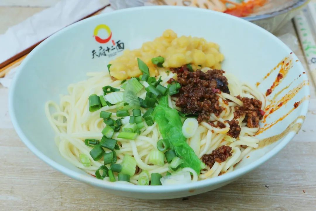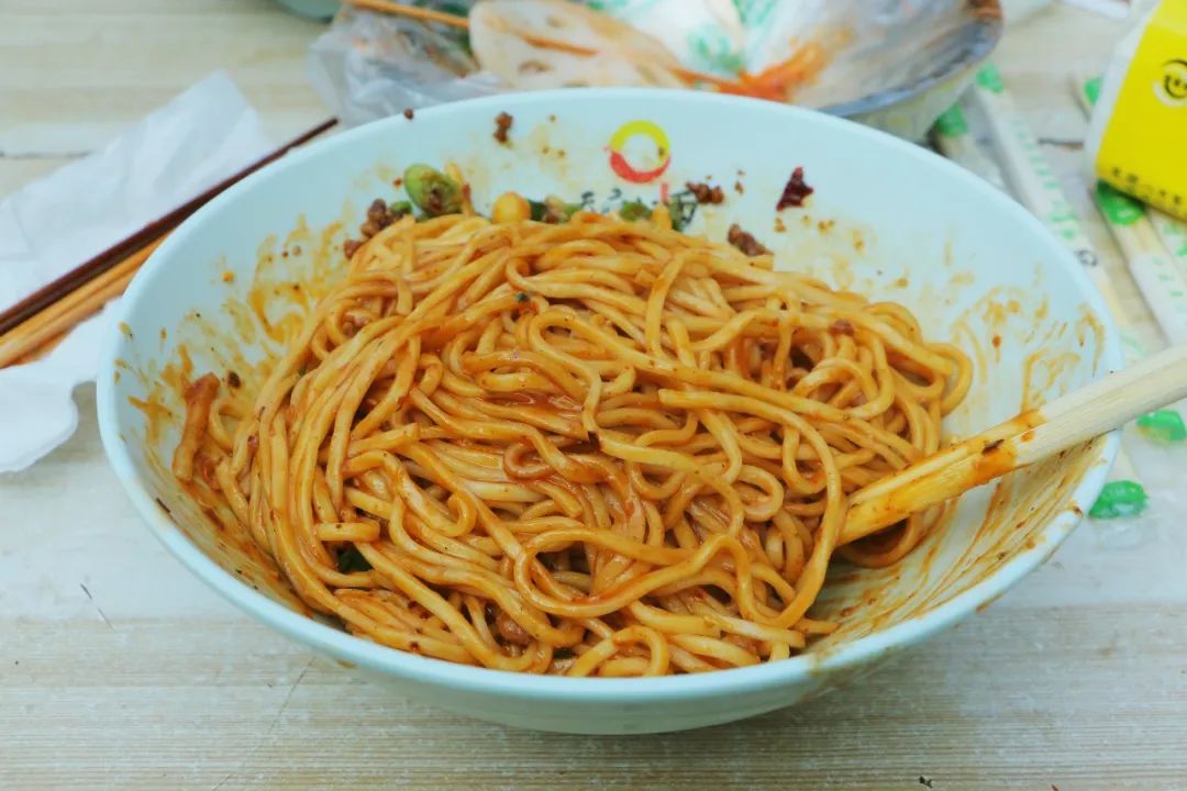 游客会被这热闹画面吸引前来,大多都会点上一份担担面尝鲜。但偷听一旁顾客的谈话也可以发现,这儿同样有许多附近生活的人,也爱来这里吃上一碗。因为店里种类多,就感觉在这里什么都能吃上一口,非常解馋且很有性价比。我常点的是他家的干拌豌杂面,面下锅几分钟捞出,配上熟豌豆、葱花、辣椒等调料,迅速搅拌让每一根面条上都裹满调料,筋道的面条身上带点儿粉质口感,吃起来有味且舒服。