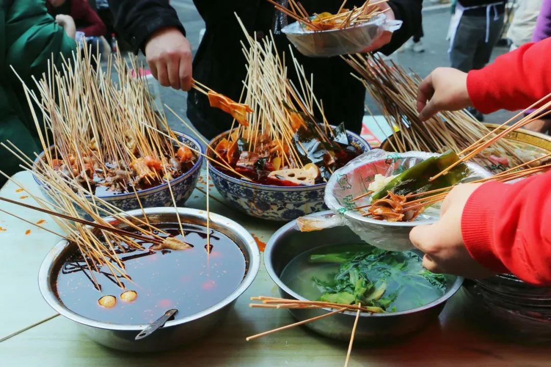 ·正在自取钵钵鸡的顾客们阿姨们不停打转,忙不过来时也不忘转身盯一圈看看有没有脚步迟疑的人,发现了就凑上去热情介绍:“这店都开了七年了,好吃哈,都好吃。”