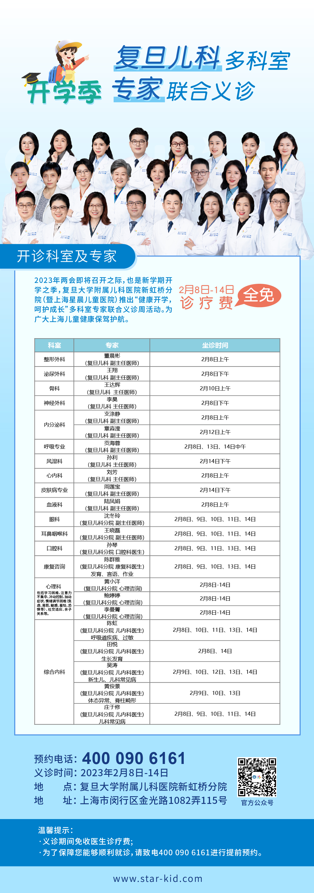 据闵行区介绍,即将迎来新学期开学季,作为开业前预热,复旦大学附属儿科医院新虹桥分院暨上海星晨儿童医院将于2023年2月8日-14日推出“健康开学,呵护成长”多科室专家联合义诊周活动,为广大上海儿童家长健康保驾护航。