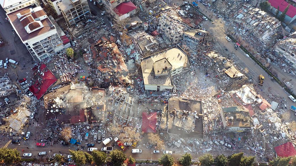 当地时间2023年2月7日,土耳其卡赫拉曼马拉什,发生7.7级和7.6级地震后,倒塌的建筑物鸟瞰图。视觉中国 图