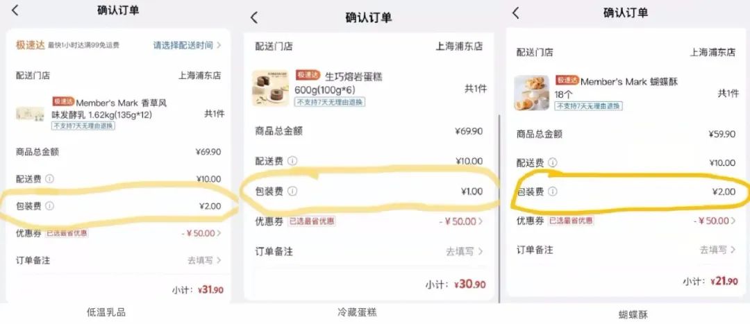 ② 为验证冰袋配置是否装错袋子,松江区消保委再次进行下单发现,购买低温乳品收取2元包装费,冷藏蛋糕收取1元包装费,不需要冷藏冷冻的蝴蝶酥收取2元包装费用,收费标准不一且混乱。