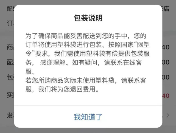 记者登录山姆APP,发现付款界面的“包装说明”显示:“为了确保商品能妥善配送到您的手中,您的订单将使用塑料袋进行包装。按照国家‘限塑令’要求,我们需使用塑料袋有偿提供包装服务,感谢理解。如有疑问,请联系在线客服。若您所购商品实际未使用塑料袋,请联系客服,我们将为您退回费用。”