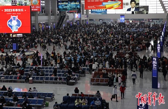 1月25日,重庆北站候车大厅,“玉兔迎春”大屏幕前,旅客人头攒动。据了解,春节假期期间(1月21日至27日),全国铁路发送旅客5017.4万人次,恢复至2019年的83.1%。2023年1月8日起,我国将新冠病毒感染从“乙类甲管”正式调整为“乙类乙管”,疫情防控新阶段正式开启,人们的生产生活有序恢复。中青报·中青网记者 陈剑/摄