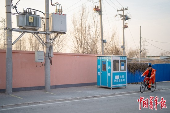 2月6日下午,北京市崔各庄费家村,一名行人路过一间停止使用的核酸亭。中青报·中青网记者 李隽辉/摄