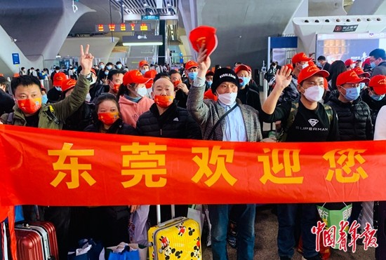 1月31日15时38分,载有600名贵州籍务工人员的D2811次列车抵达广州南站。车上的乘客主要是节前已在广东就业的返乡员工,还有少量新入粤务工人员,他们前往广州、东莞、深圳、佛山、中山等珠三角地市开启新一年的工作和生活。中青报·中青网记者 林洁/摄