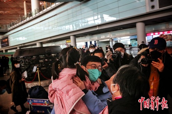 1月8日上午,北京首都机场,一个小女孩与刚刚归来的家人相拥。当天是我国对新型冠状病毒感染实施“乙类乙管”的第一天,即日起,全国各机场恢复原有入境旅客流程,不再要求入境旅客进行落地核酸和集中隔离。中青报·中青网记者 赵迪/摄