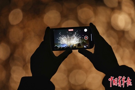 1月21日,农历兔年除夕夜,山东省枣庄市台儿庄古城,一名游客用手机拍摄国家级非物质文化遗产“打铁花”表演。中青报·中青网记者 李建泉/摄