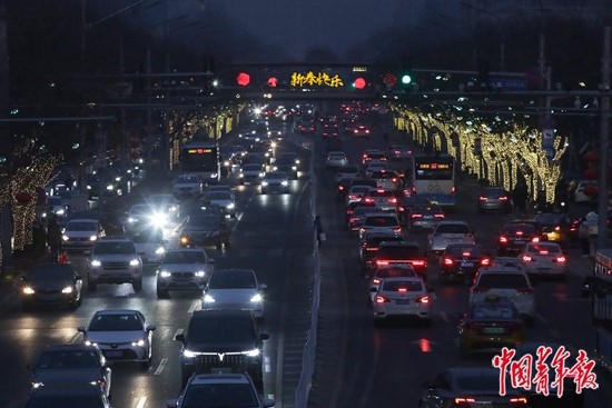 2月5日,周末晚高峰,北京市工体北路上车水马龙。中青报·中青网记者 陈剑/摄
