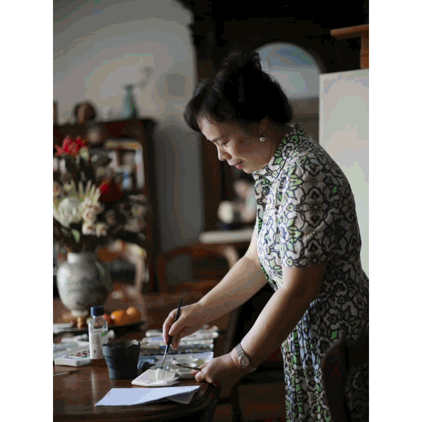 爱琴和儿子我画的时候很放松,家里有事我就先做事,有空余时间再画。偶尔需要的话就休息一天,画水彩就像在家里自娱自乐。