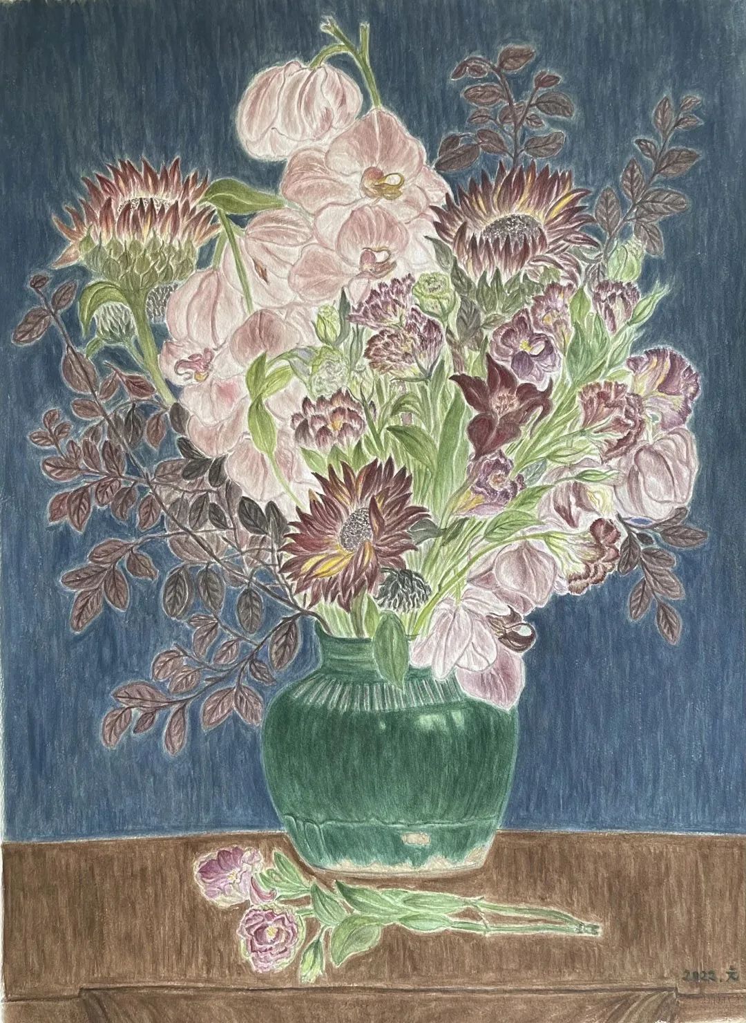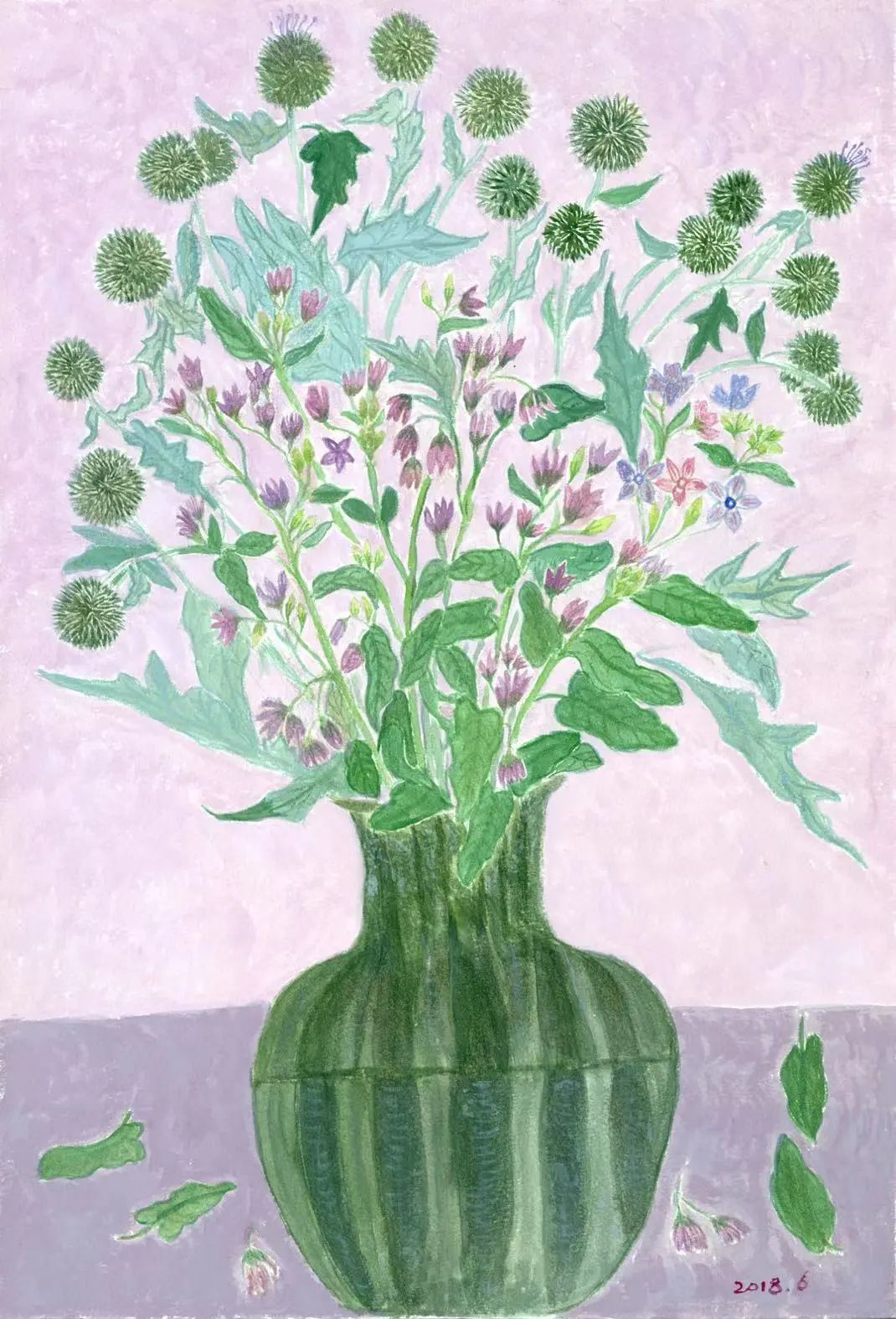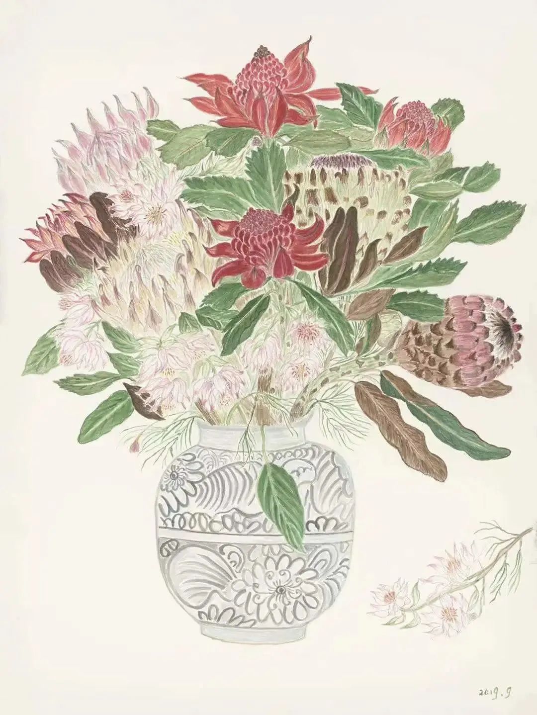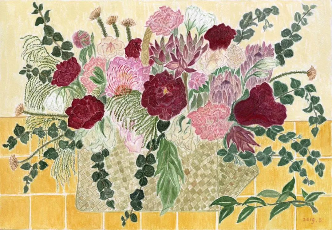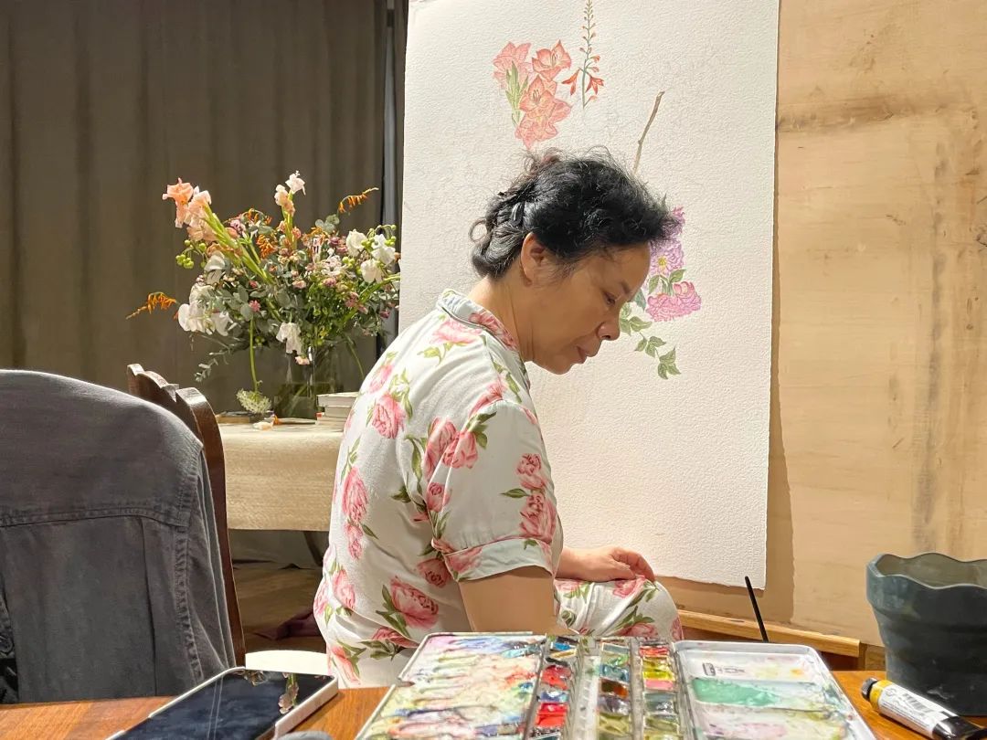 我的画都是照着实际的花写生的,第一天它是这个形状,过两天它会完全不一样。有的花期很短就一两天,好多花买过来很快就枯了。我有次画一个绣球花,它大概不到三个小时整个都耷拉下去了。现在对于不同品种的花,我都有一点底了。哪个花容易枯萎,我就赶紧把花画好,叶子就最后画。